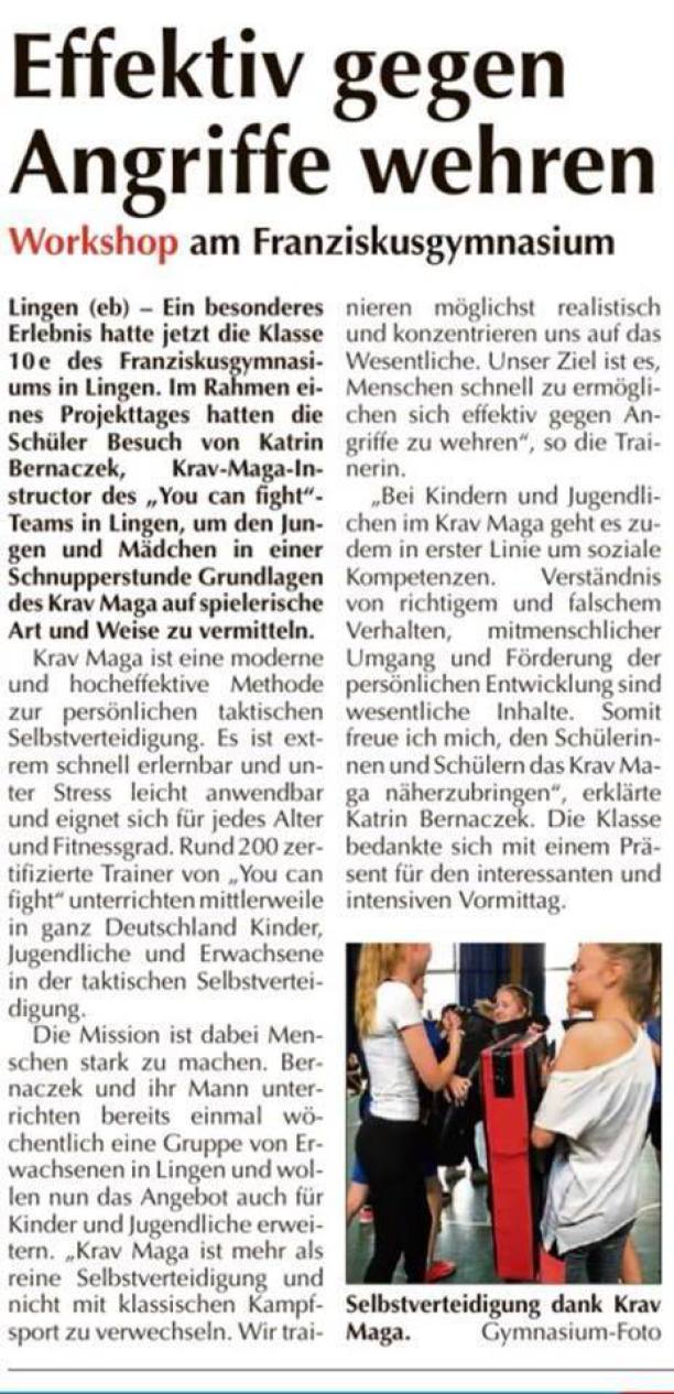 Wir arbeiten dabei gerne mit Schulen und Einrichtungen zusammen. Hier finden Sie z.B. einen Bericht über ein Training am Franziskusgymnasium in Lingen: KRAV MAGA - Workshop am Franziskusgymnasium